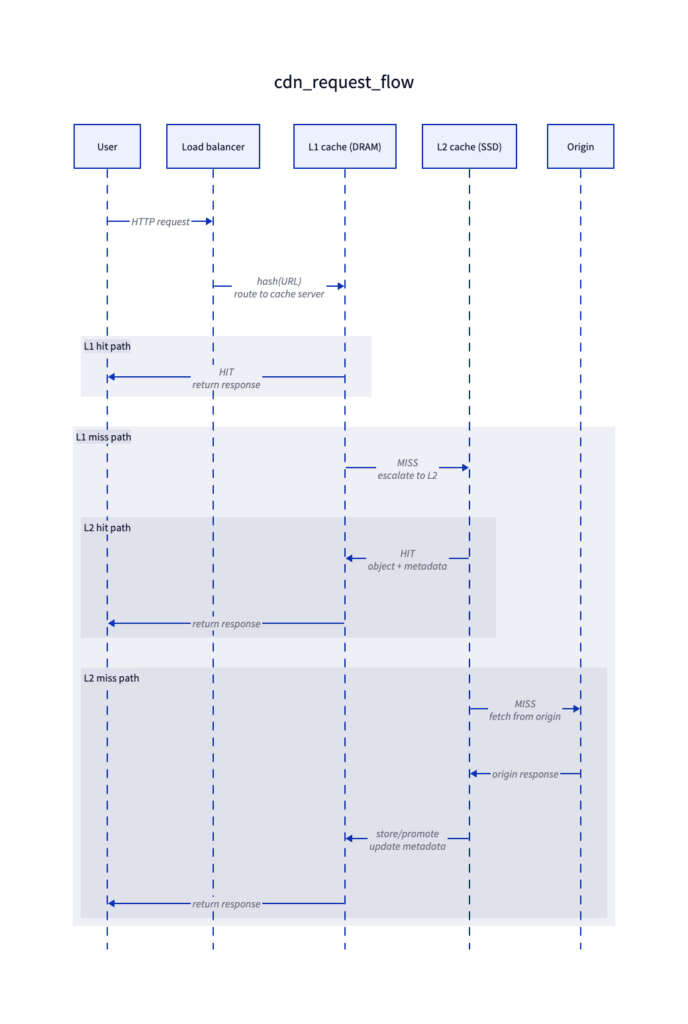 CDN caching is a hierarchy designed to minimize distance, both physical and logical, between users and data. Each point of presence (PoP) serves requests through a hit/miss pipeline: