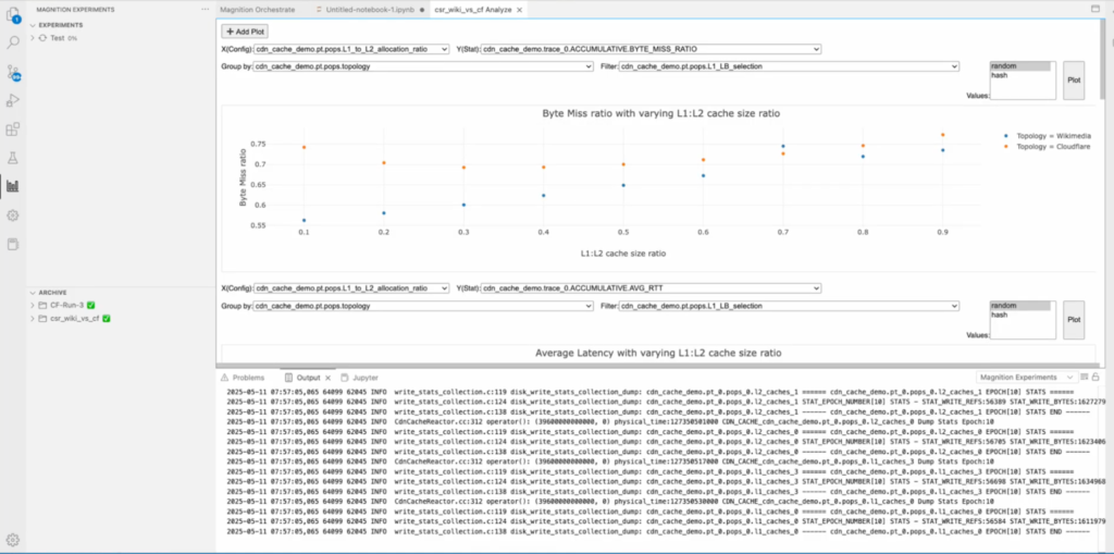 Magnition System Designer models these systems as connected components with publishable parameters. Each run replays real CDN traces, typically 60- to 200-GB datasets representing hours of global traffic.